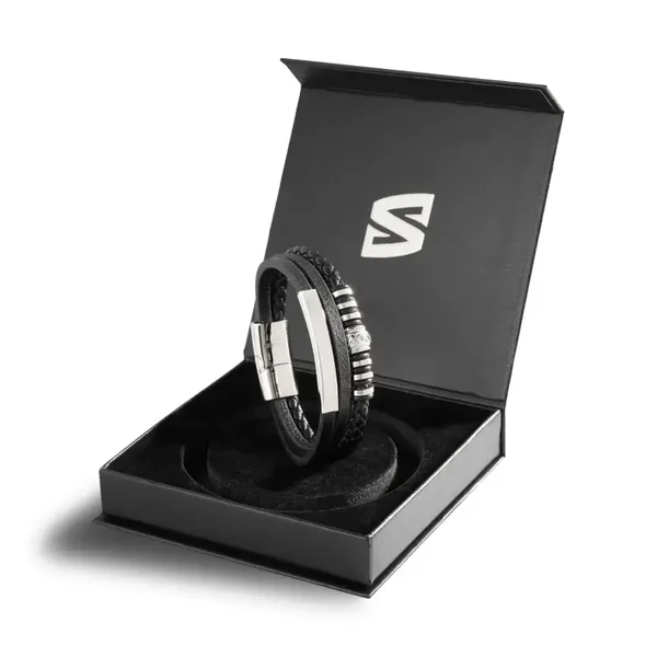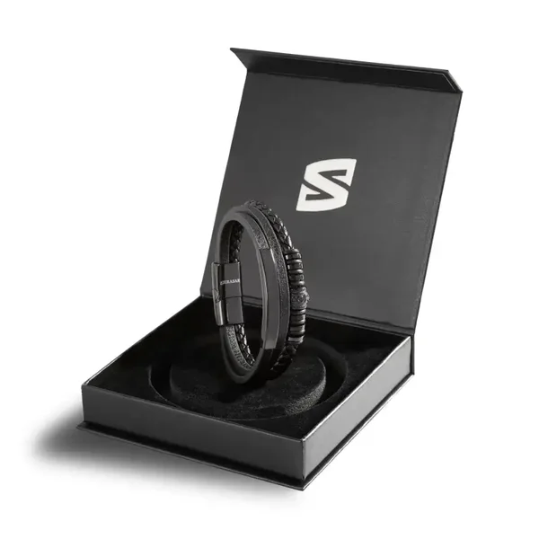 Deze armband heeft een omtrek van 20 cm. Hij is verkrijgbaar in zilver en zwart.