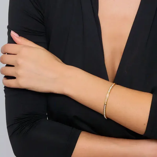 Roestvrijstalen armbanden met strass en parelmoerlook.