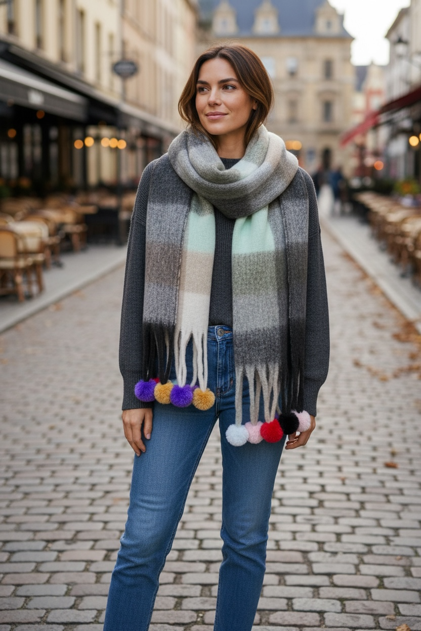 Deze sjaal is warm en superzacht.Met zijn afmetingen van 250 cm x 42 cm is hij de ideale metgezel voor een koude dag.Het hoogtepunt zijn de gekleurde pompons aan de uiteinden.