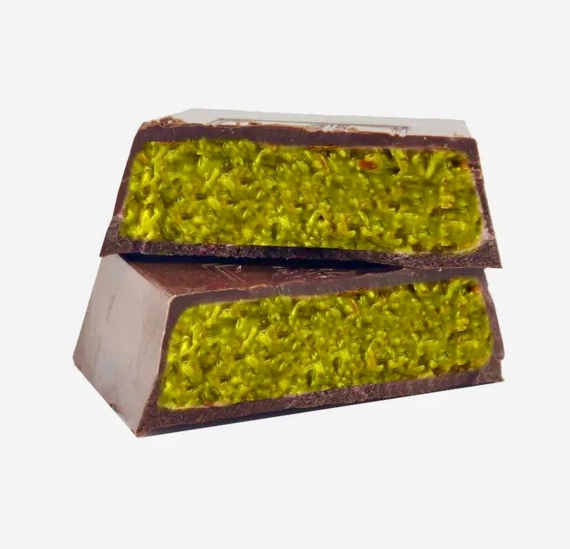 Ingrediënten: Melkchocolade (suiker, cacaomassa, volle melkpoeder, emulgator: sojalecithine, bourbon vanille), pistachecrème (pistachenoten 45%, suiker, zonnebloemolie, cacaoboter, melkpoeder, weipoeder, extra vierge olijfolie, emulgator: sojalecithine), engelenhaar (tarwebloem, water, maïszetmeel, zonnebloemolie, zout, conserveermiddel: kaliumsorbaat, emulgator: sojalecithine), zout, eetbaar bladgoud, pistache. Cacao ten minste 33,6%.