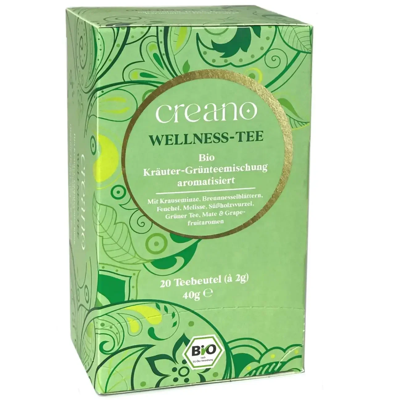 Creano WELLNESS THEE is een harmonieuze, frisse en fruitige mix van kruiden, groene thee, zoethoutwortel, mate en grapefruit aroma’s. Ideaal voor de hele dag, te drinken warm of koud. De positieve eigenschappen van kruiden en groene thee gecombineerd met fruitige aroma’s maken deze blend uniek - pure wellness.