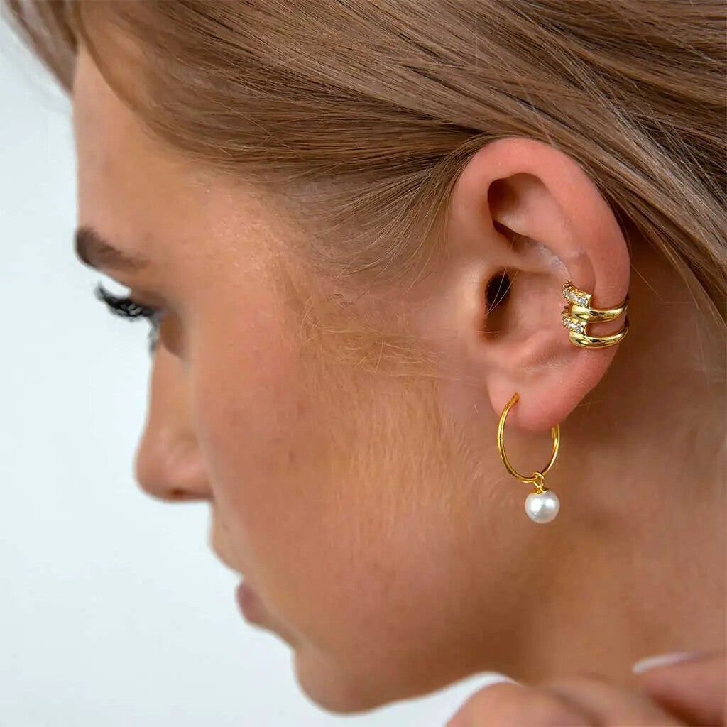 Tegenpolen trekken elkaar aan: Op een wafelfijne, 18-karaats vergulde hoepel, krijgt de natuurlijke parel van Kisha extra ruimte en kan het verleidelijke effect volledig ontwikkelen.